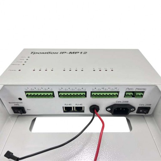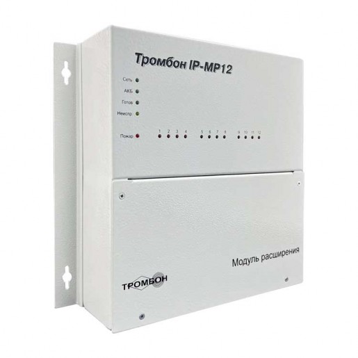 Модуль расширения «Тромбон IP-МР12» предназначен для работы в составе системы звукового вещания, оповещения и управления эвакуацией «Тромбон IP» только совместно с «Тромбон IP-МО8». Модуль служит для приёма тревожных сигналов от систем ППКП и передаче их на модуль оповещения «Тромбон IP-МО8» посредством локальной вычислительной сети.